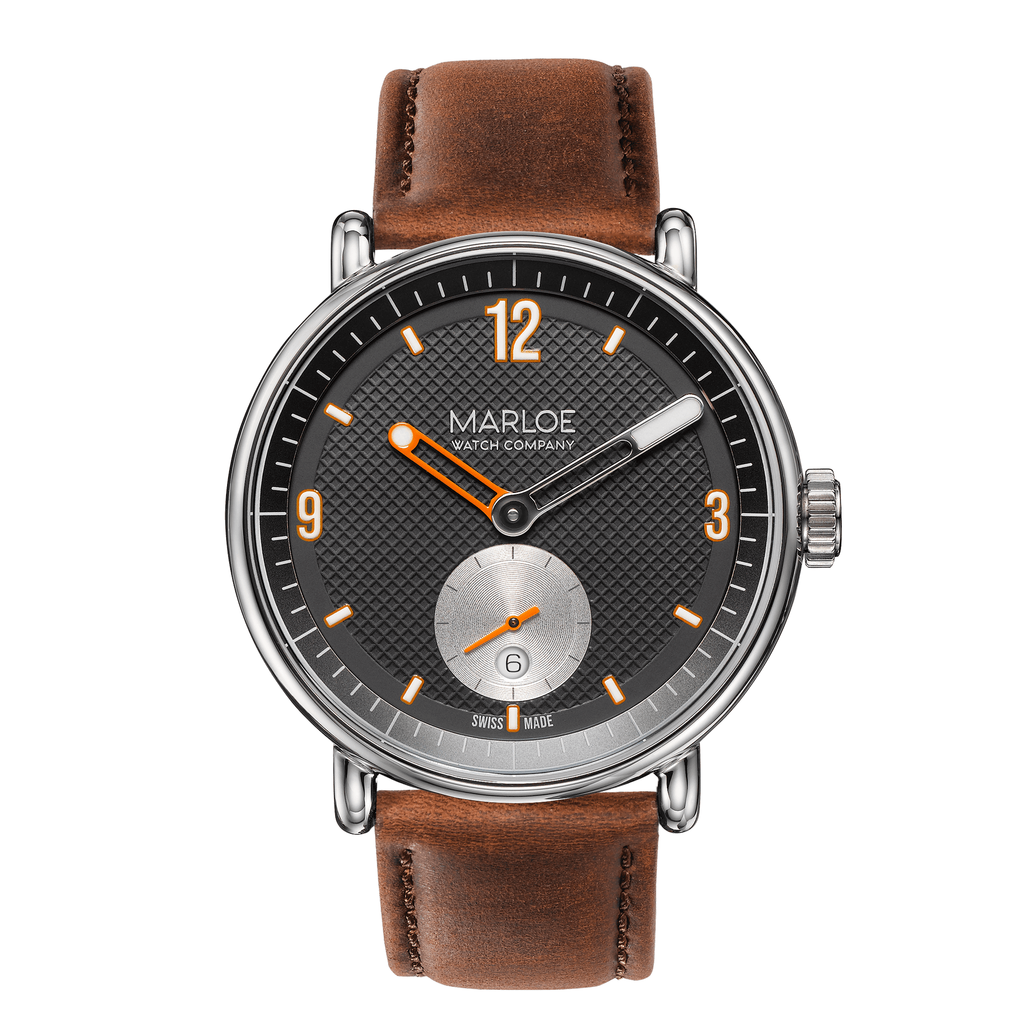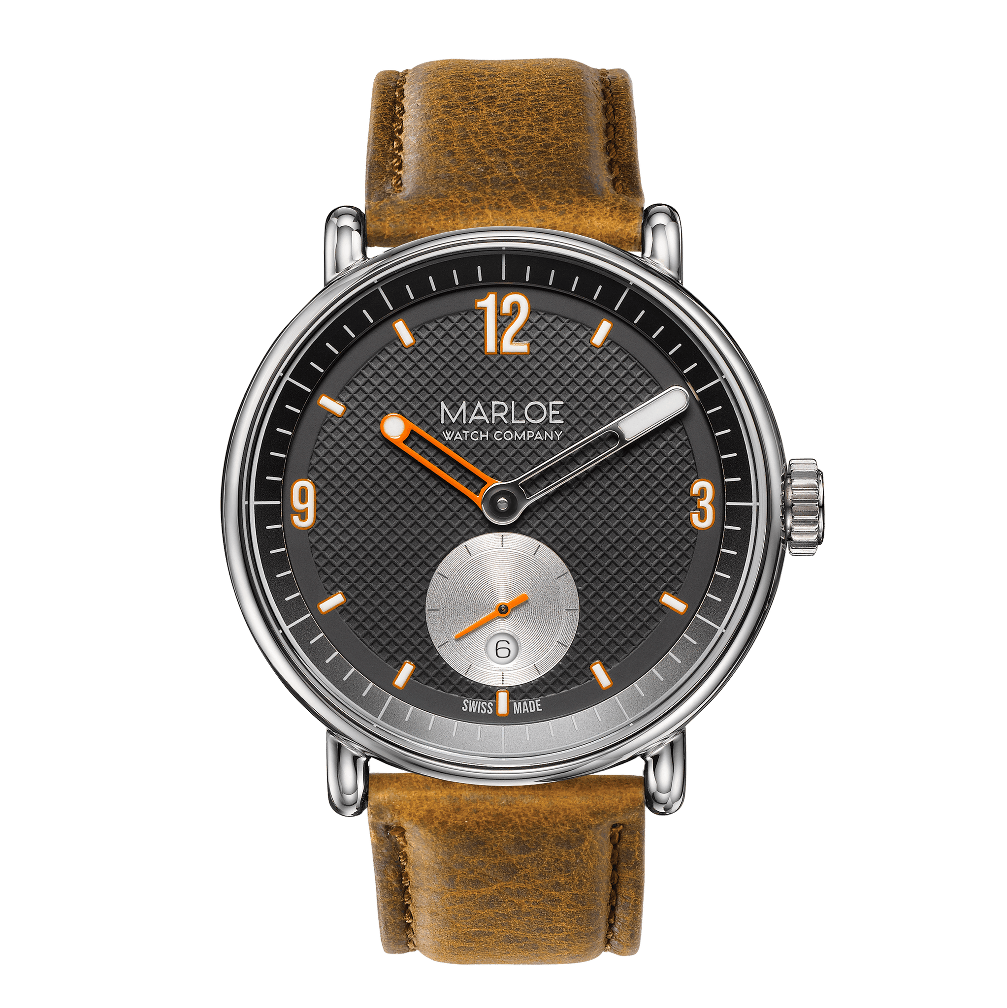 Our trench watch-inspired Daytimer is equipped with the Swiss-made Sellita SW-261-1 manual movement, featuring a sub-second dial at 6 o'clock that integrates a date complication.