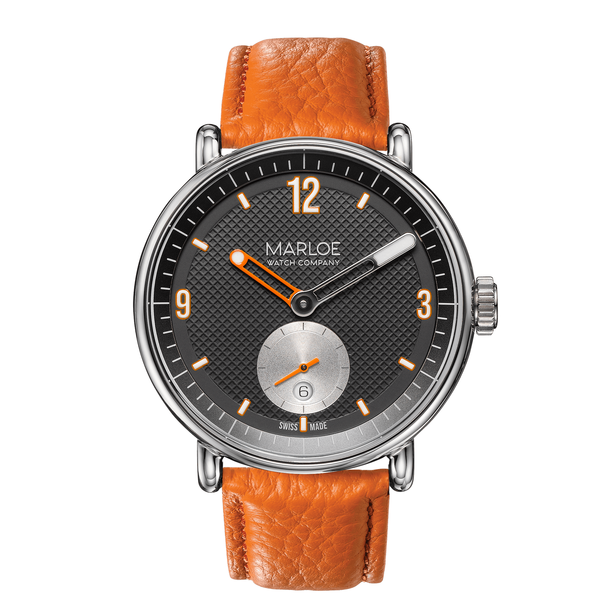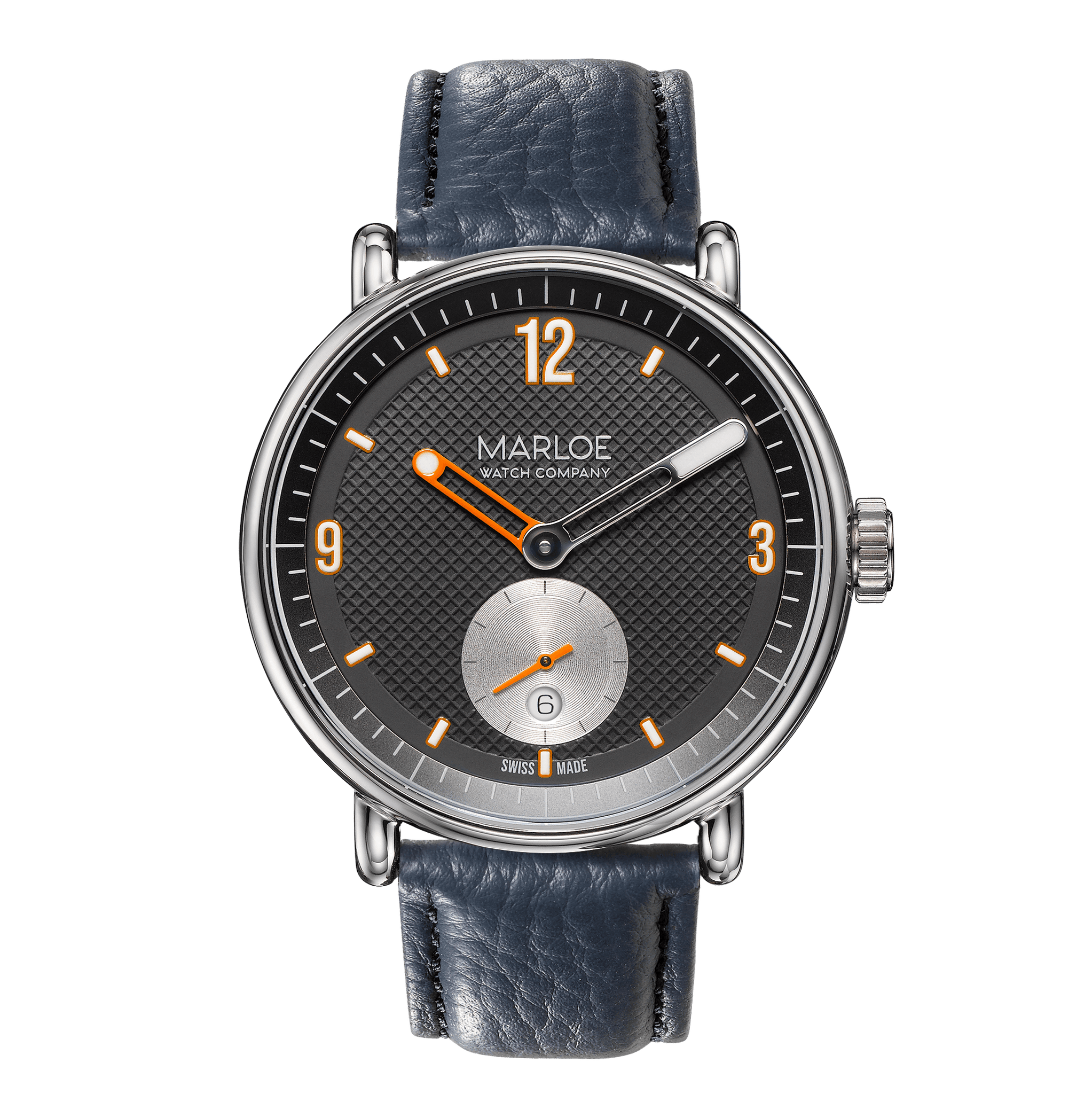 We couldn’t have had a daytime watch (Madainn) without an evening alternative - so a dark, textured version in deep blue/grey with orange accents was born for when daylight fades. Alongside the dark palette is a large silvery sub-dial, reminiscent of our moon passing over the twilight sky.